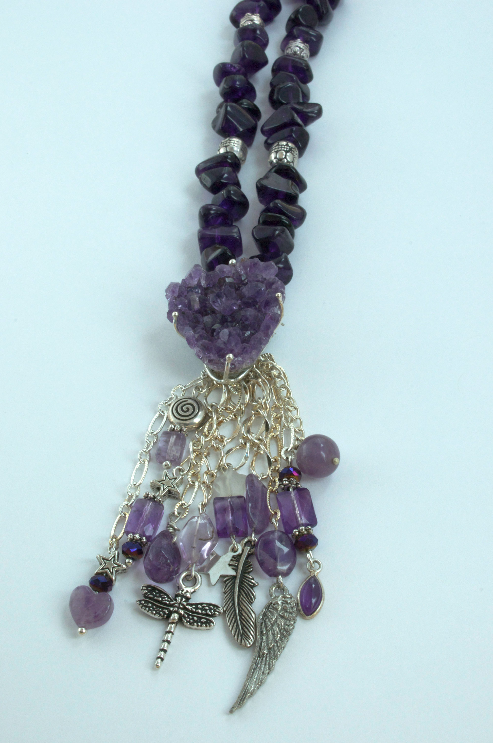 Natural diamond-shaped amethyst stone 1”across x 1/2” long with 2” long dangles with charms and amethyst beads strung on an 18” silver wire with amethyst and sculpted pewter beads. Charms include an angel’s wing, feather, star, dragonfly and spiral pewter beads.