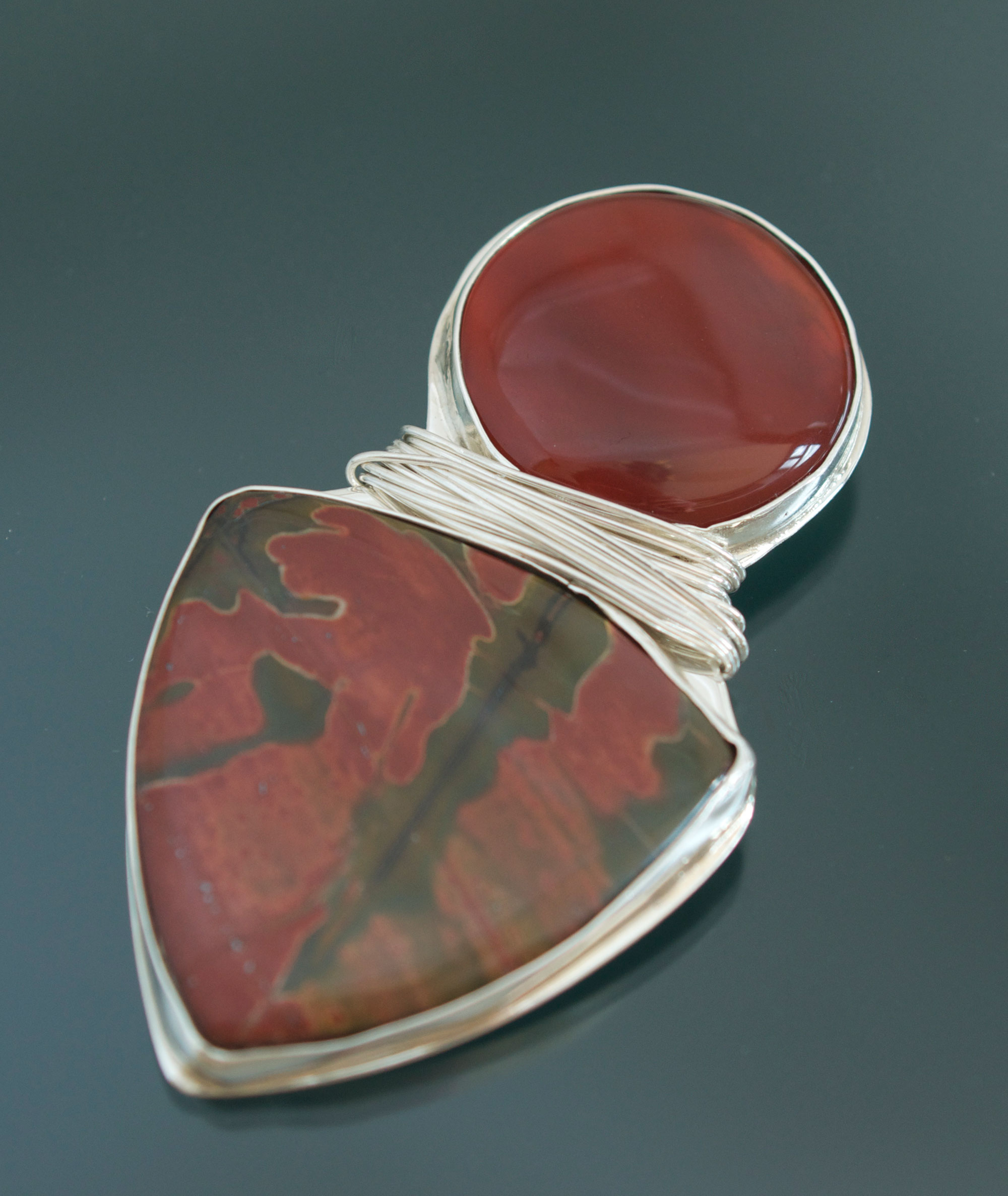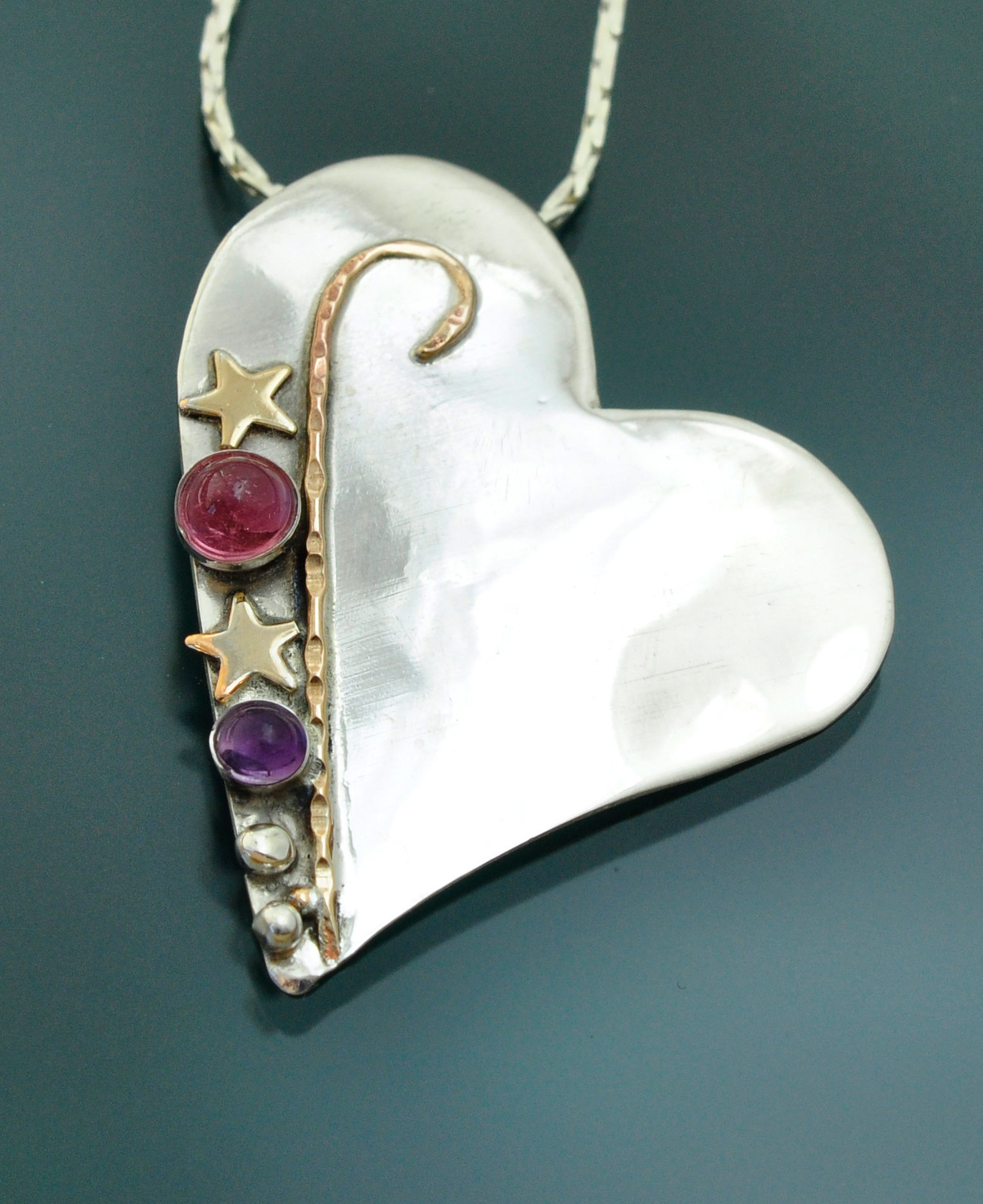 Gold-filled wire, brass appliques and semiprecious stones on sterling silver heart.