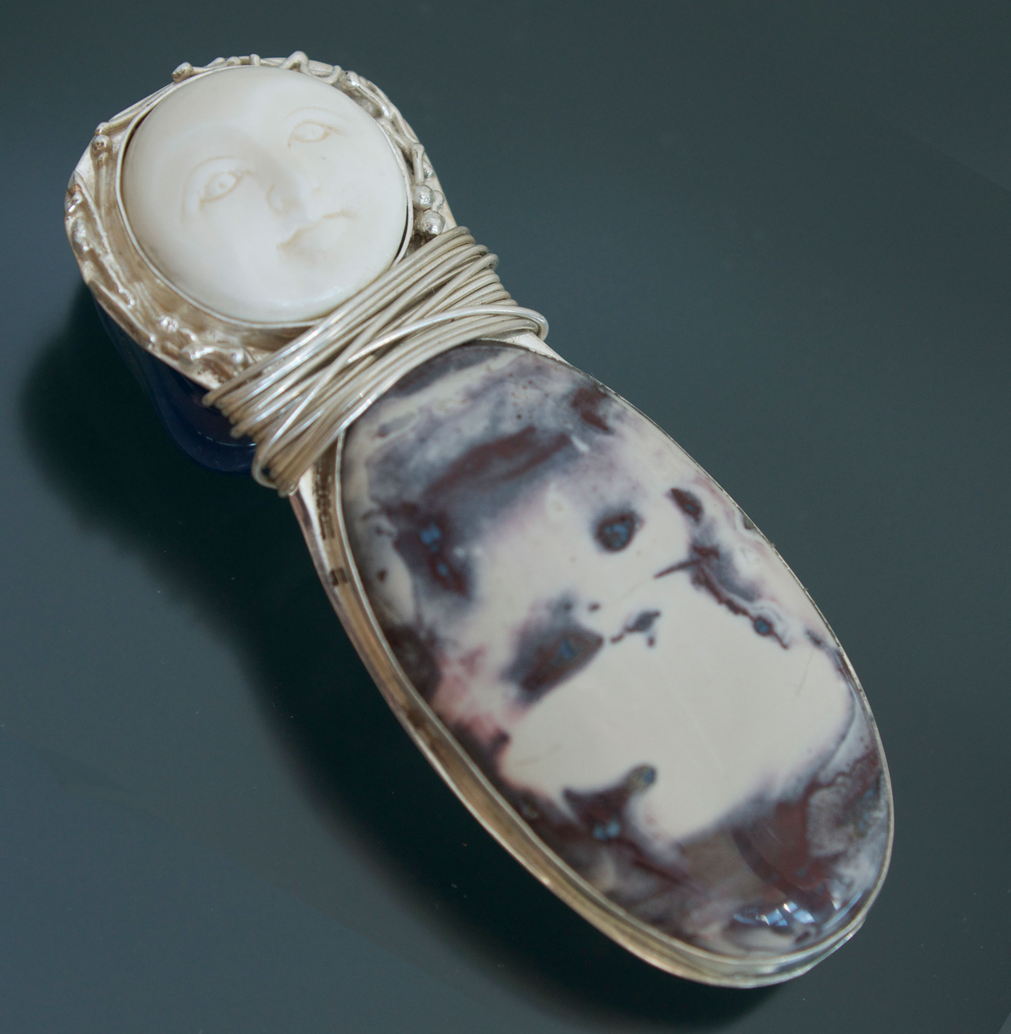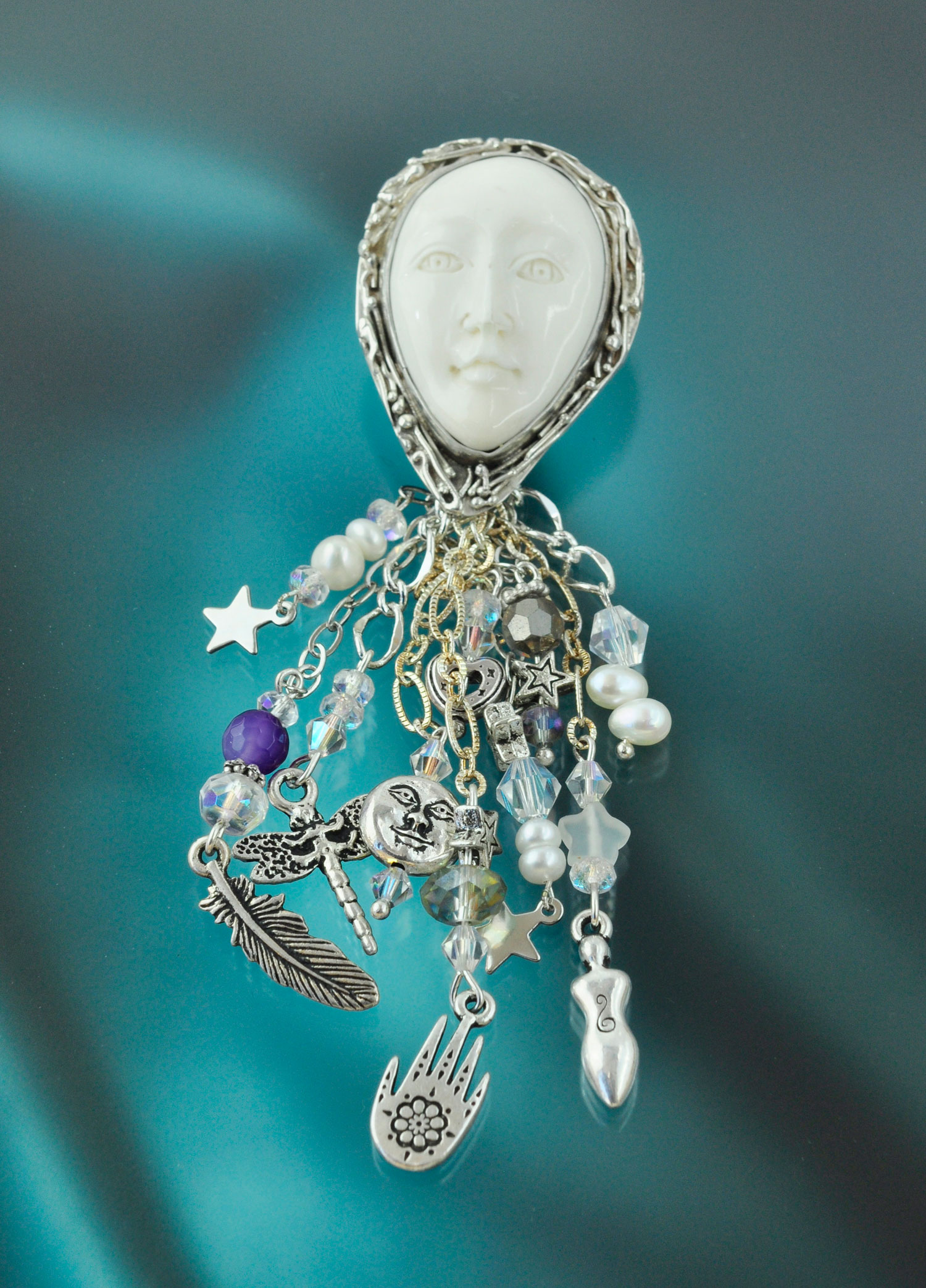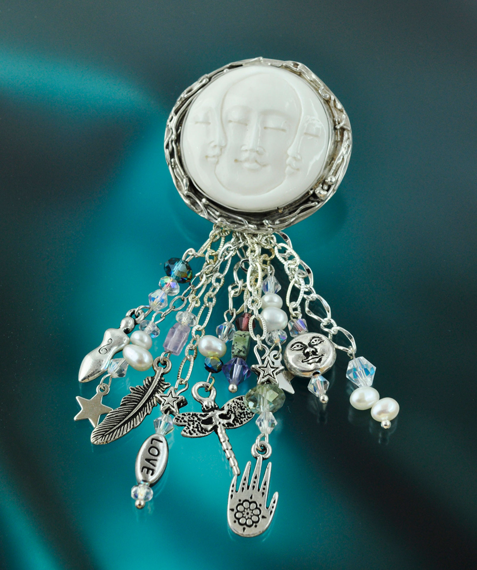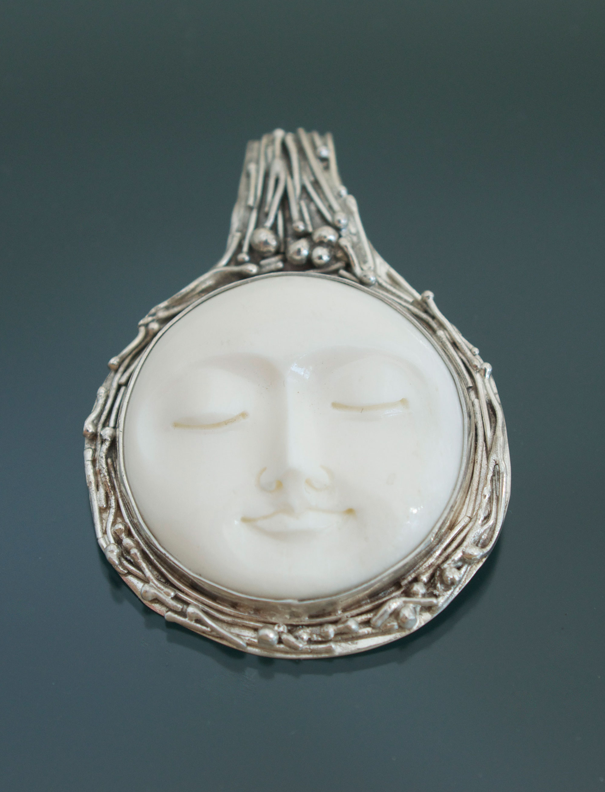 Serene bone-carved moon face set in sterling silver with silver applique and assorted dangles.
