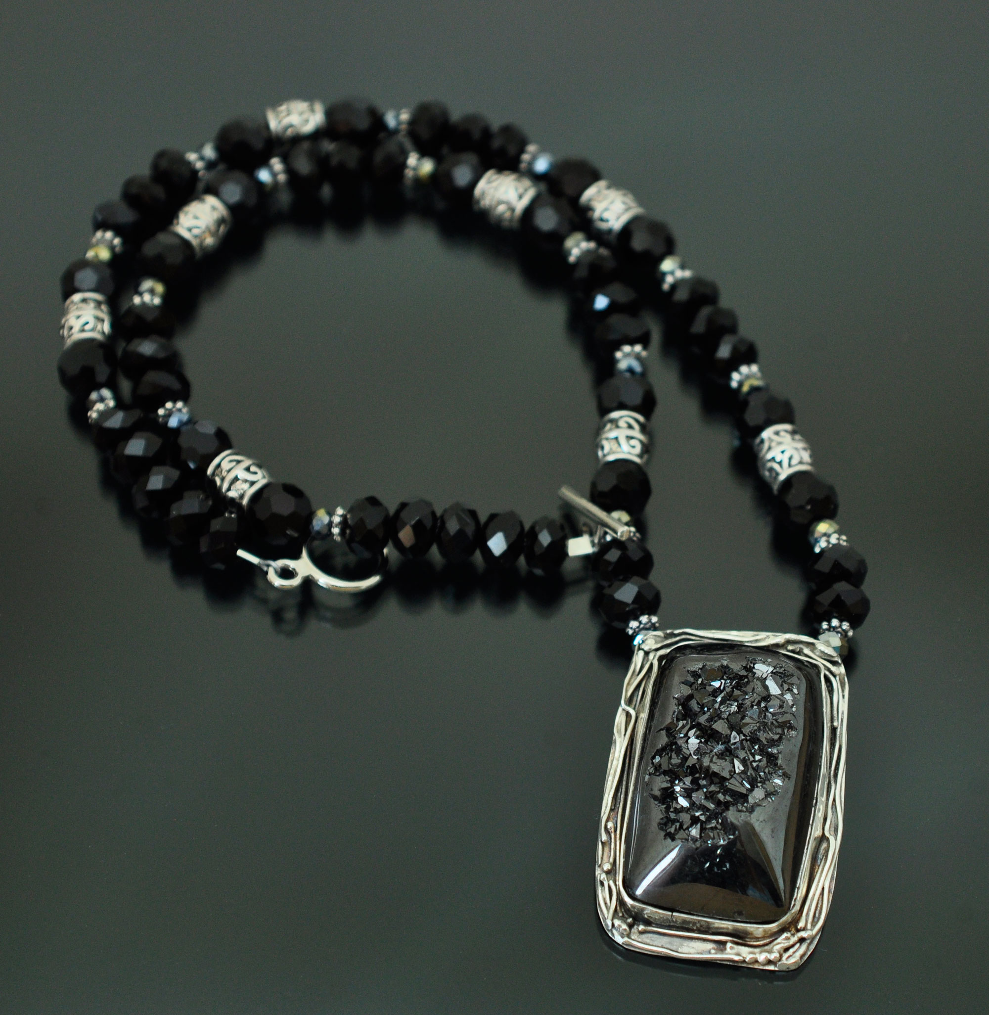 This gorgeous druzy is set in sterling silver hung on an 18'' onyx bead necklace.