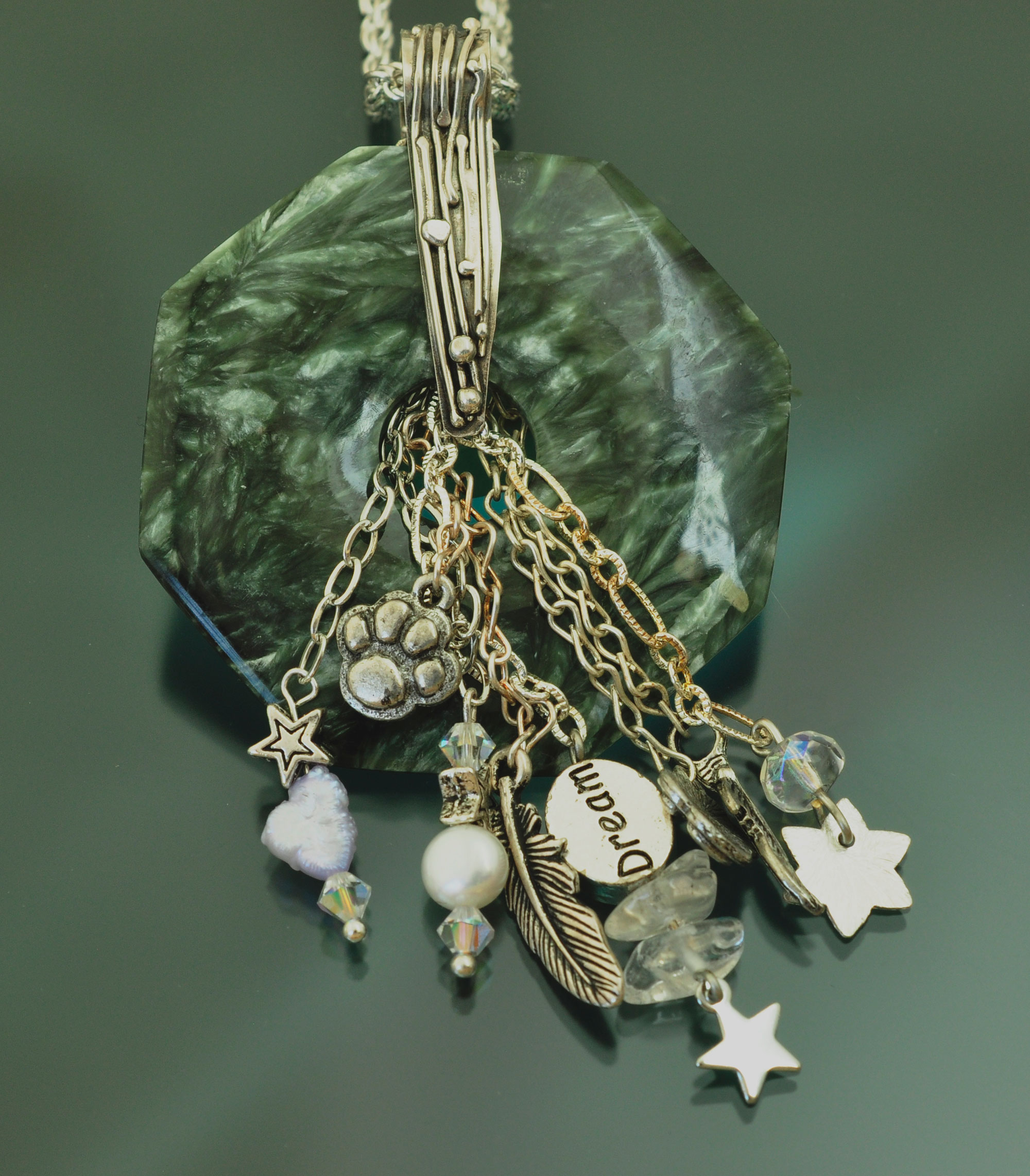 Seraphinite is an angel stone. This one has a handmade sterling silver bail with assorted dangles and charms.