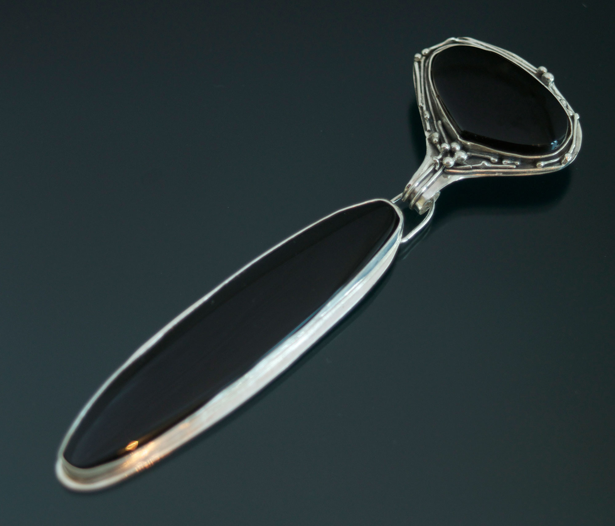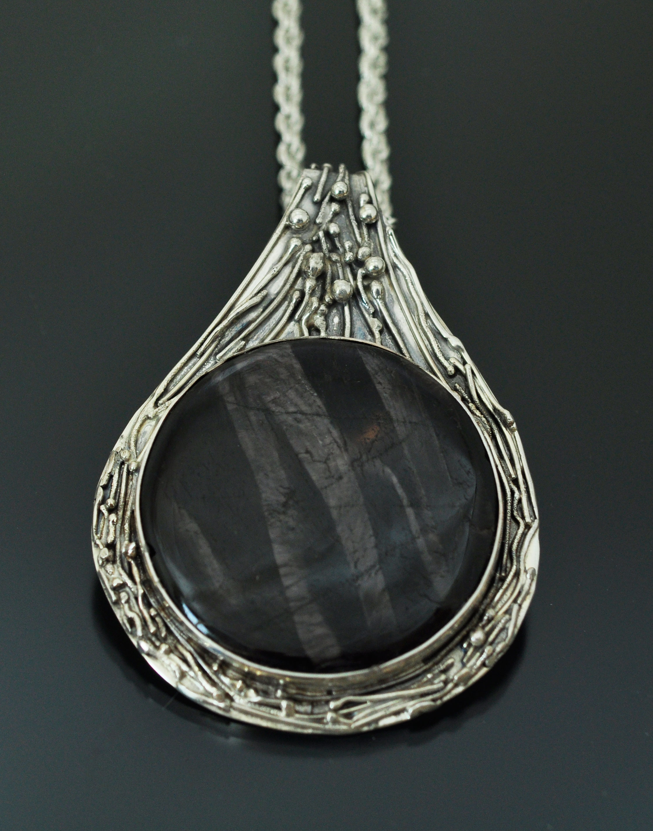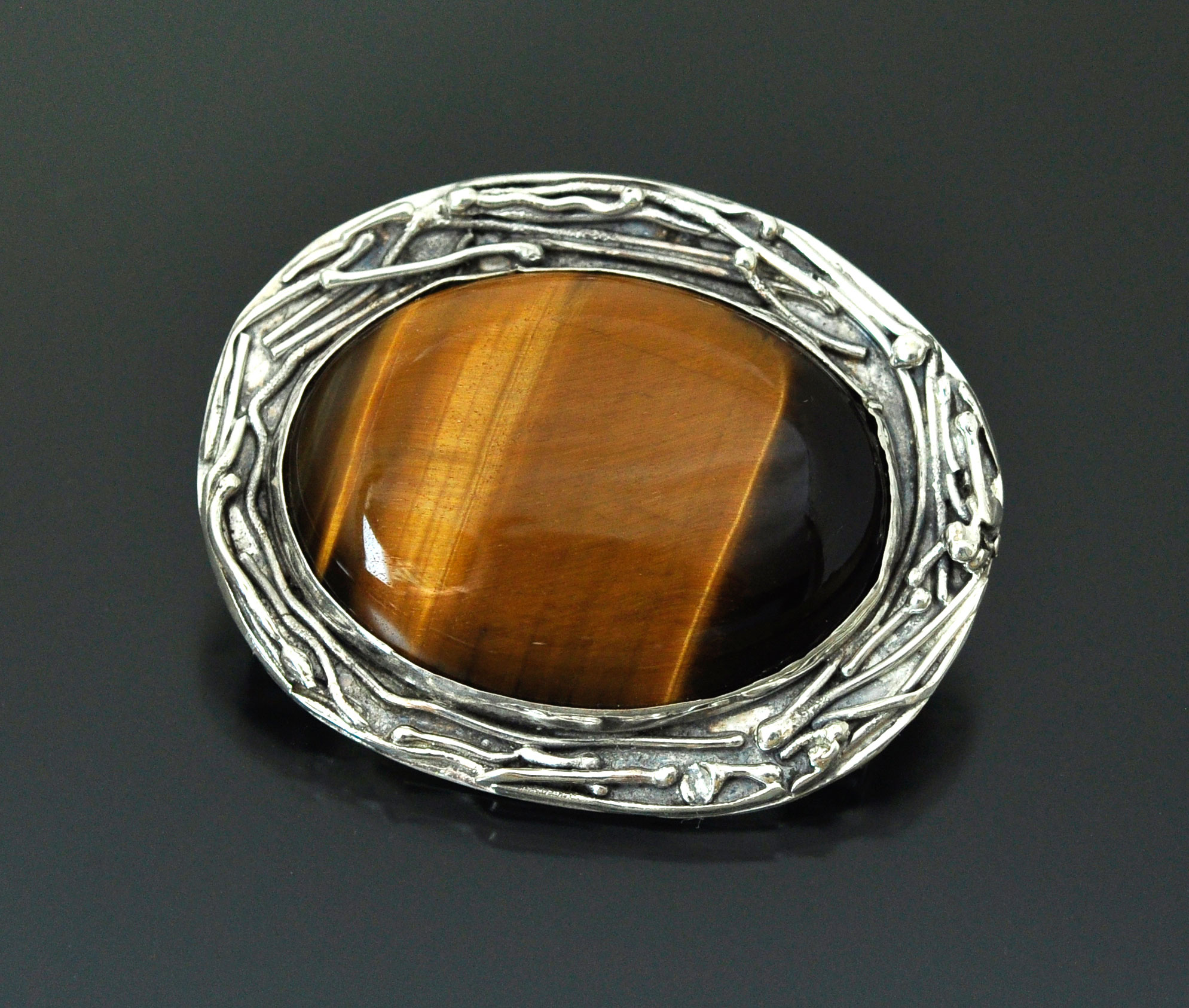 Sterling Silver hand with brass appliques and semi-precious stones; garnet, amethyst, onyx and others.