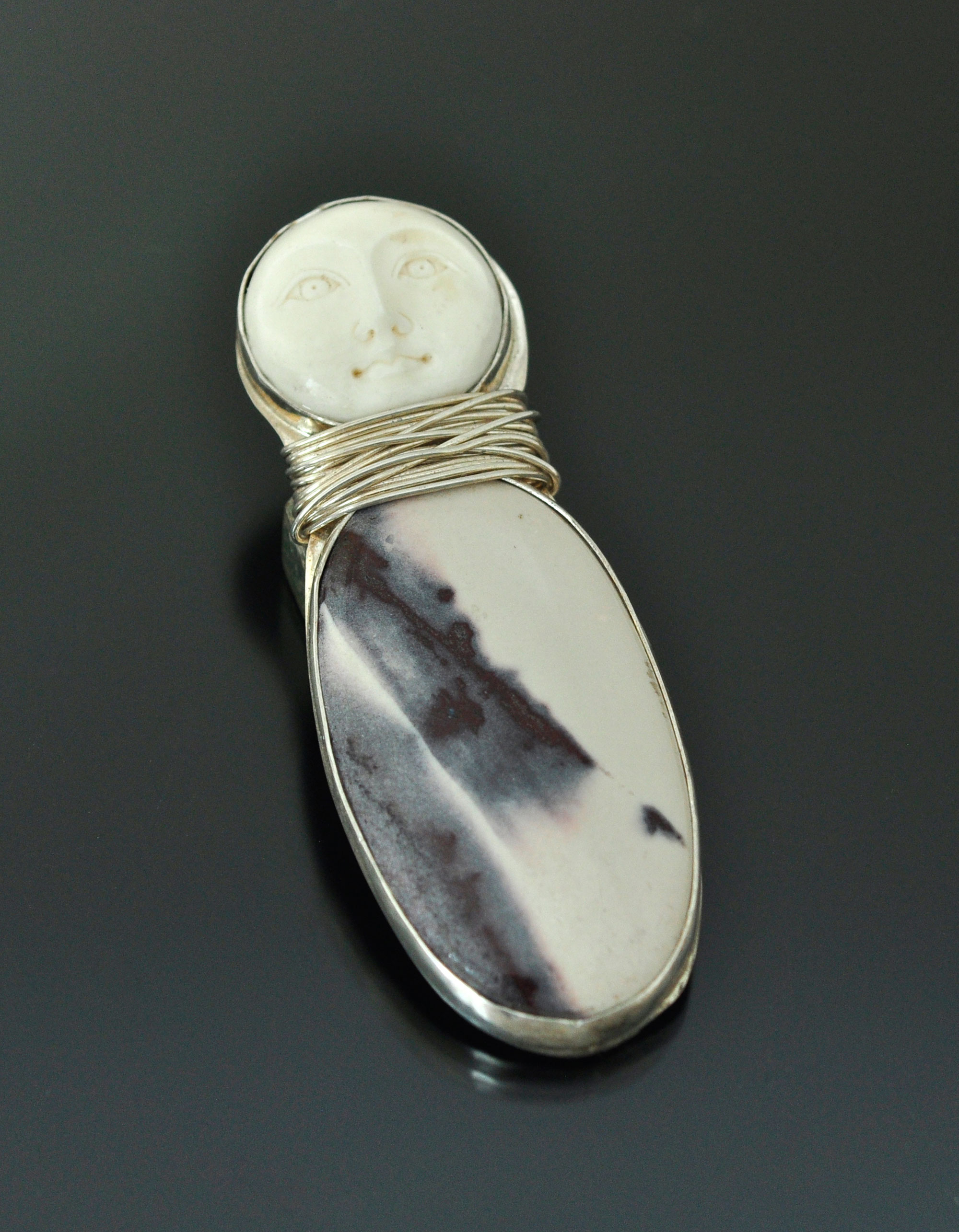 Carved bone moon face set in sterling silver with assorted charm dangles.