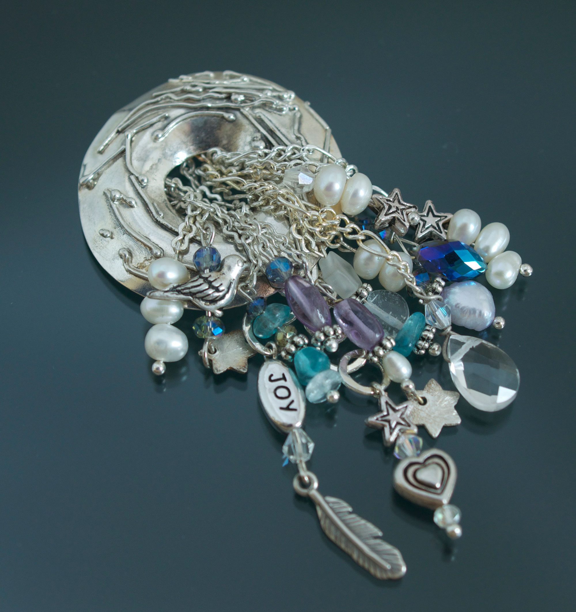 Gold-filled wire, brass appliques with semi-precious stones on sterling silver moon.
